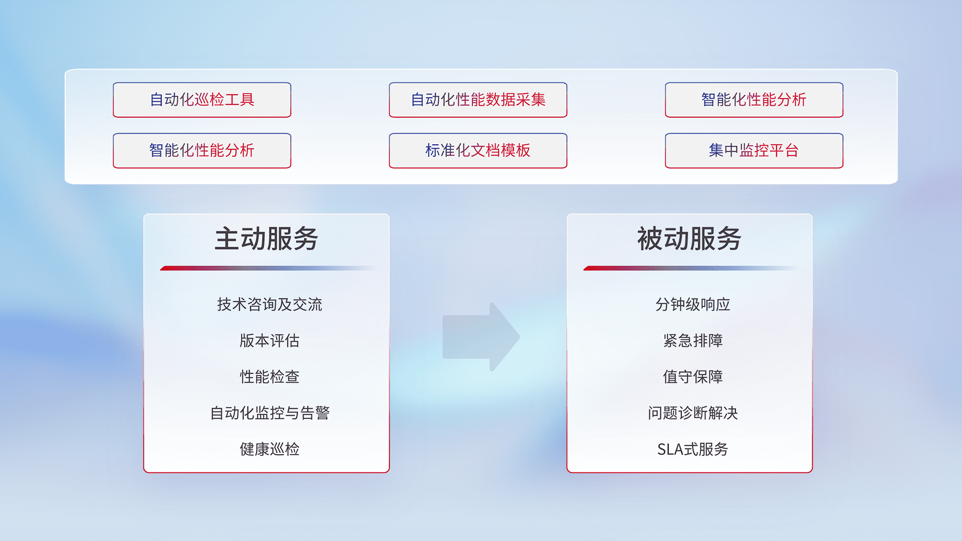 智能化工具和标准化文档,,,保障服务质量,,,提供主动服务(包含技术咨询、、、、版本评估、、性能检查、、自动化监控与告警、、、、健康巡检)和被动服务包含(分钟级响应、、、、紧急排障、、值守保障、、问题诊断解决、、、、SLA服务)。。。。