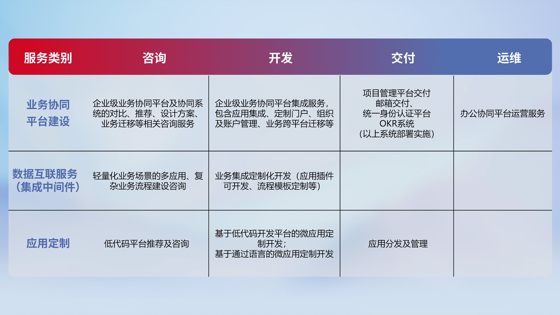 针对钉钉、、、、企微、、IDaas等平台级产品提供产品的规划、、方案、、、、交付、、定制化开发等服务,,,,实现如统一协同办公、、智能客户服务、、、混合会议管理、、、、智能数据查询、、、、等业务场景,,实现数字化转型。。。。